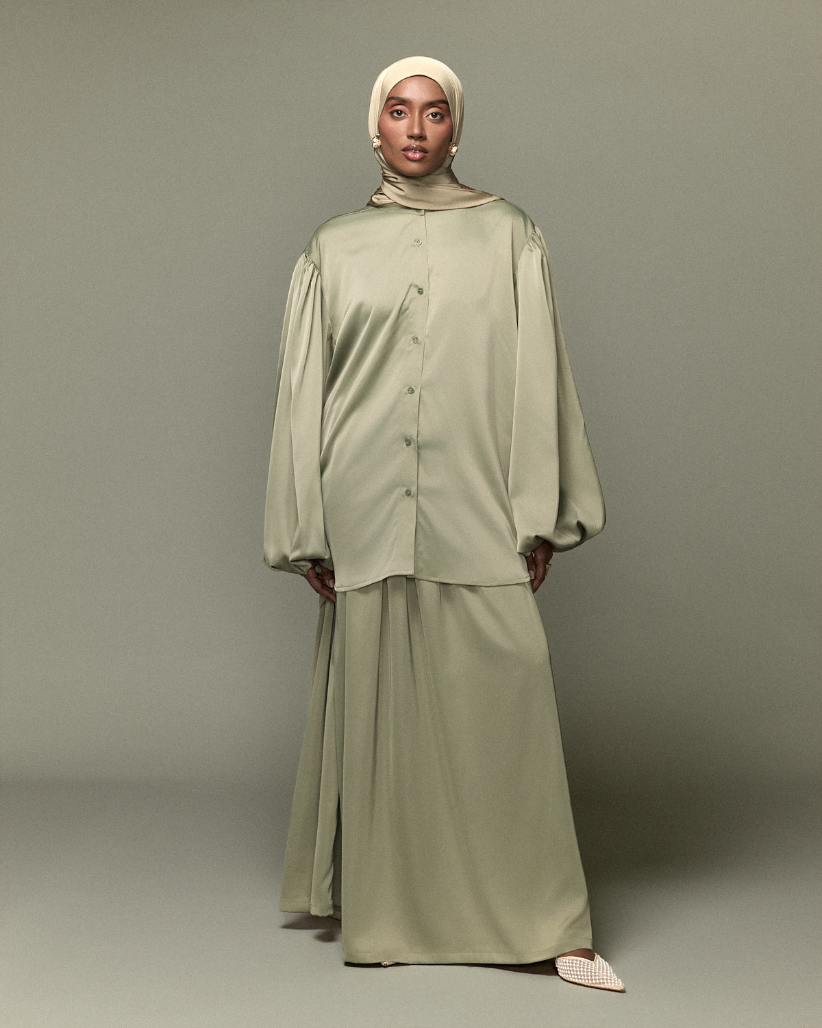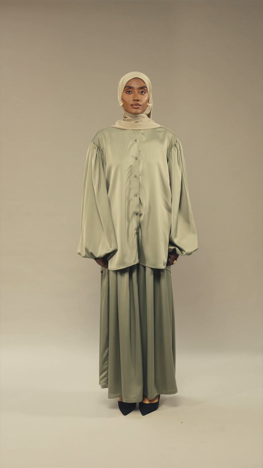 Un duo sophistiqué, composé d’une blouse aux manches ballon et d’une jupe fluide en satin vert. Son tissu soyeux et sa coupe aérienne apportent une élégance naturelle et une allure intemporelle. Pratique et raffinée, la jupe est dotée de poches discrètes, alliant confort et style.