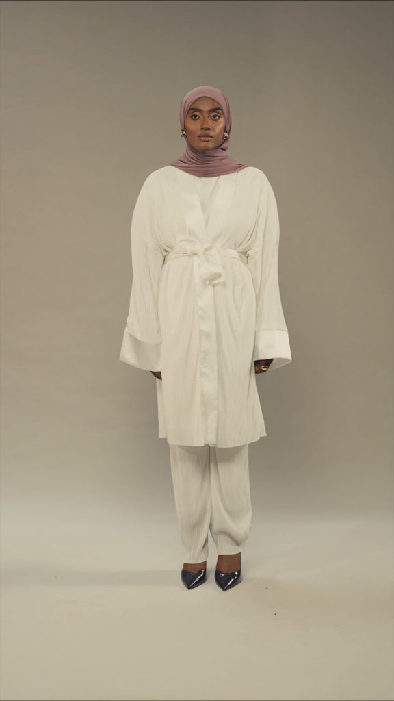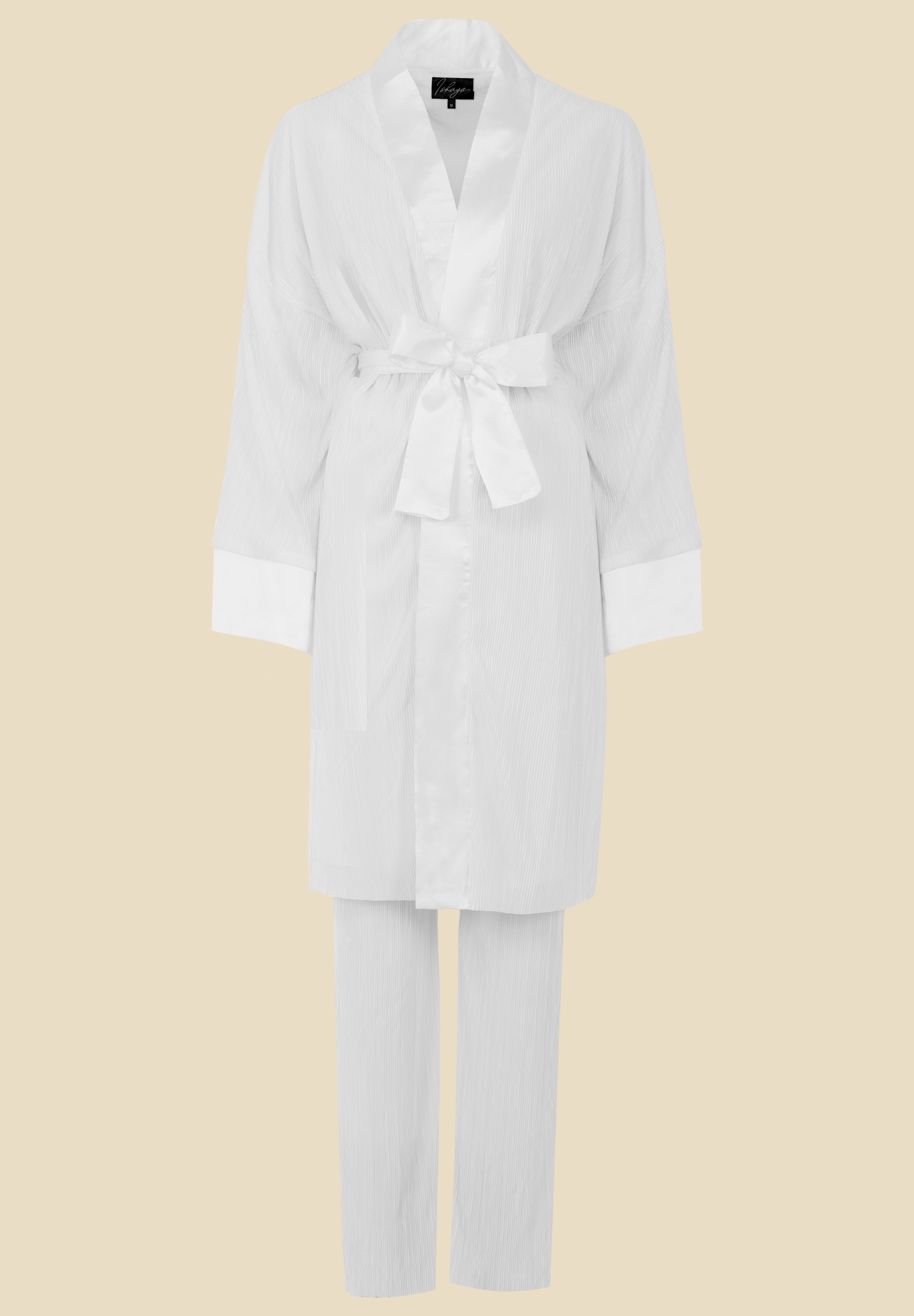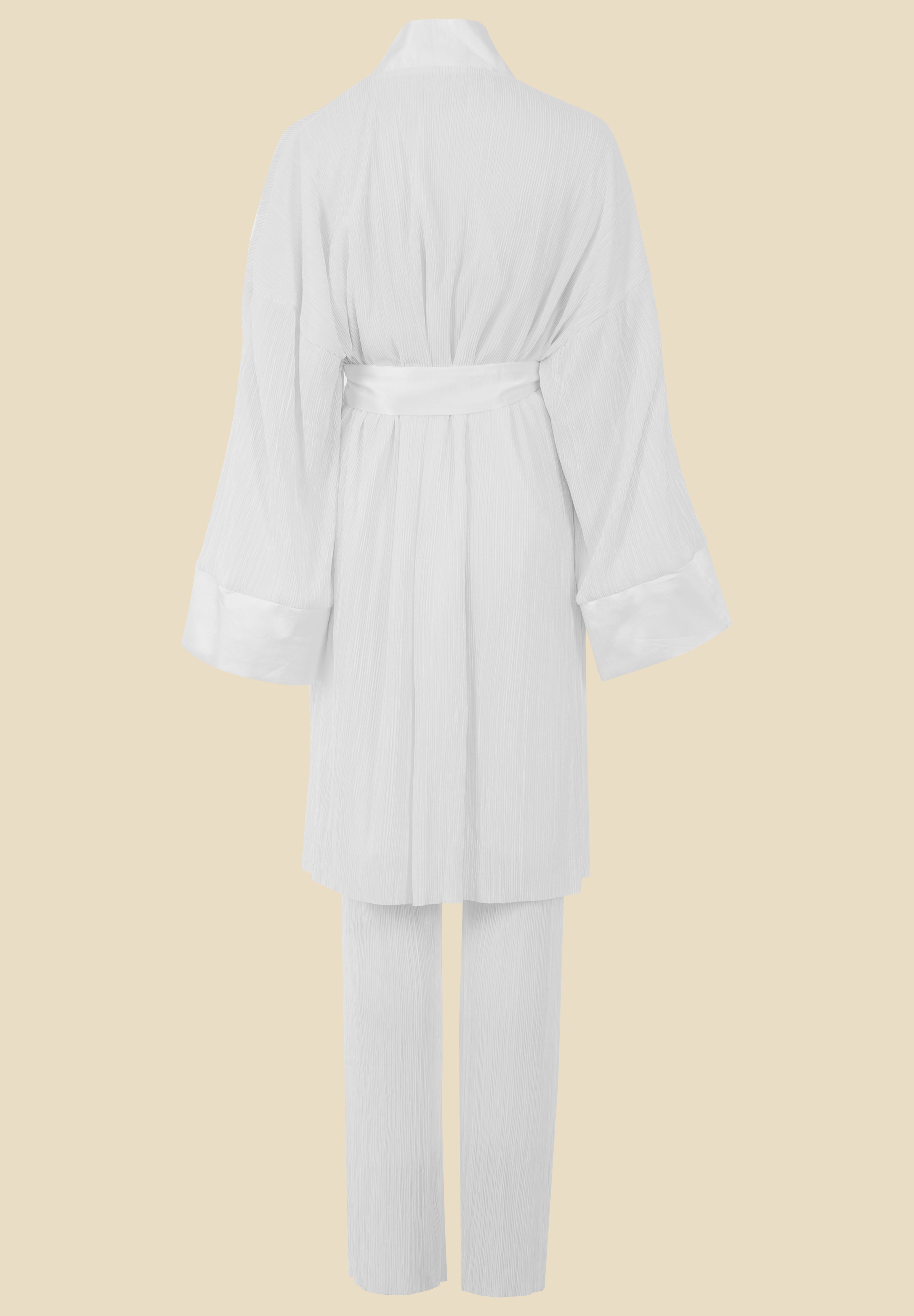 Un ensemble entièrement plissé composé d’un kimono et d’un pantalon. Les manches et le col du kimono sont agrémentés de satin pour apporter une touche d’élégance. Une ceinture en satin amovible vient compléter ce look.