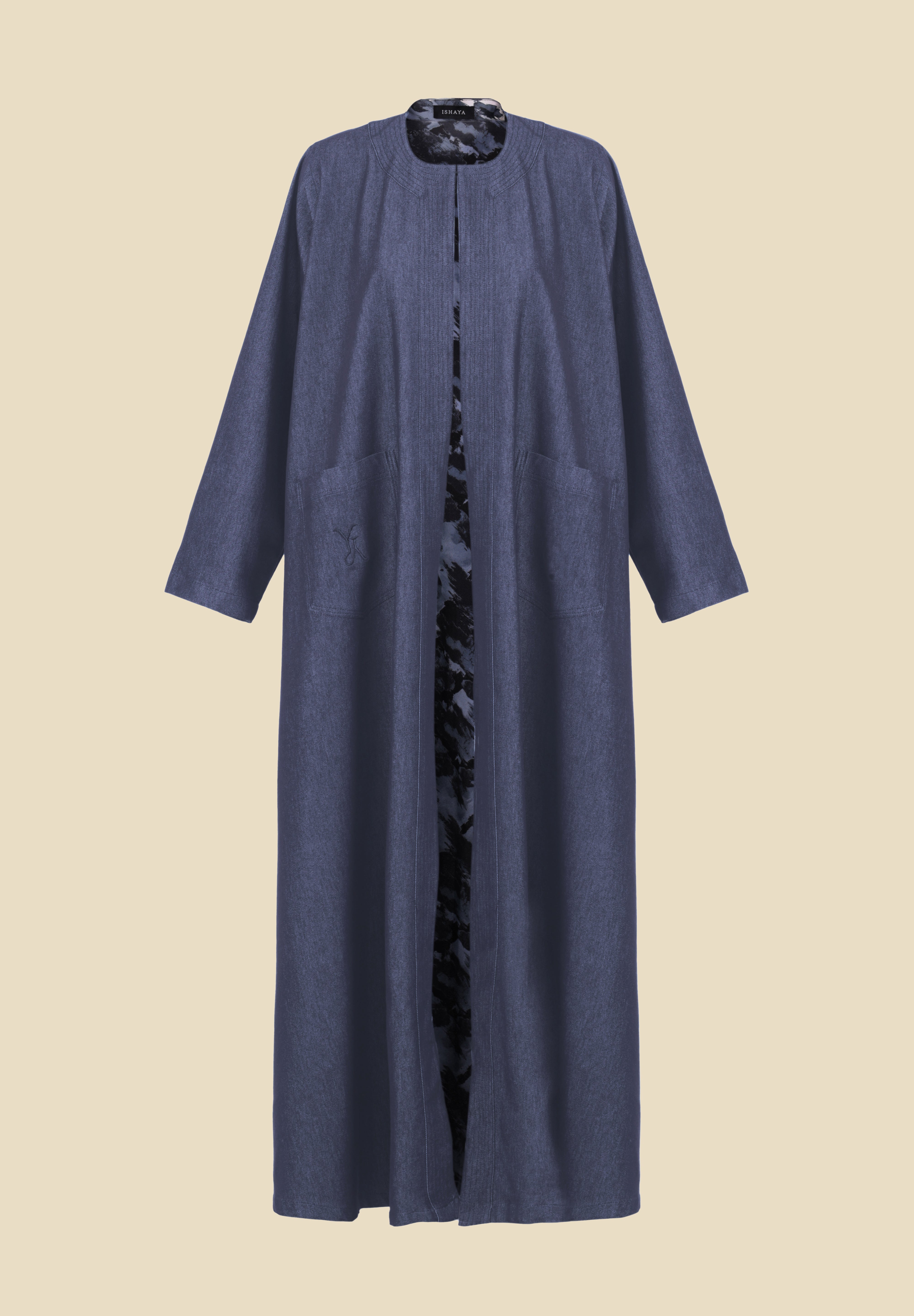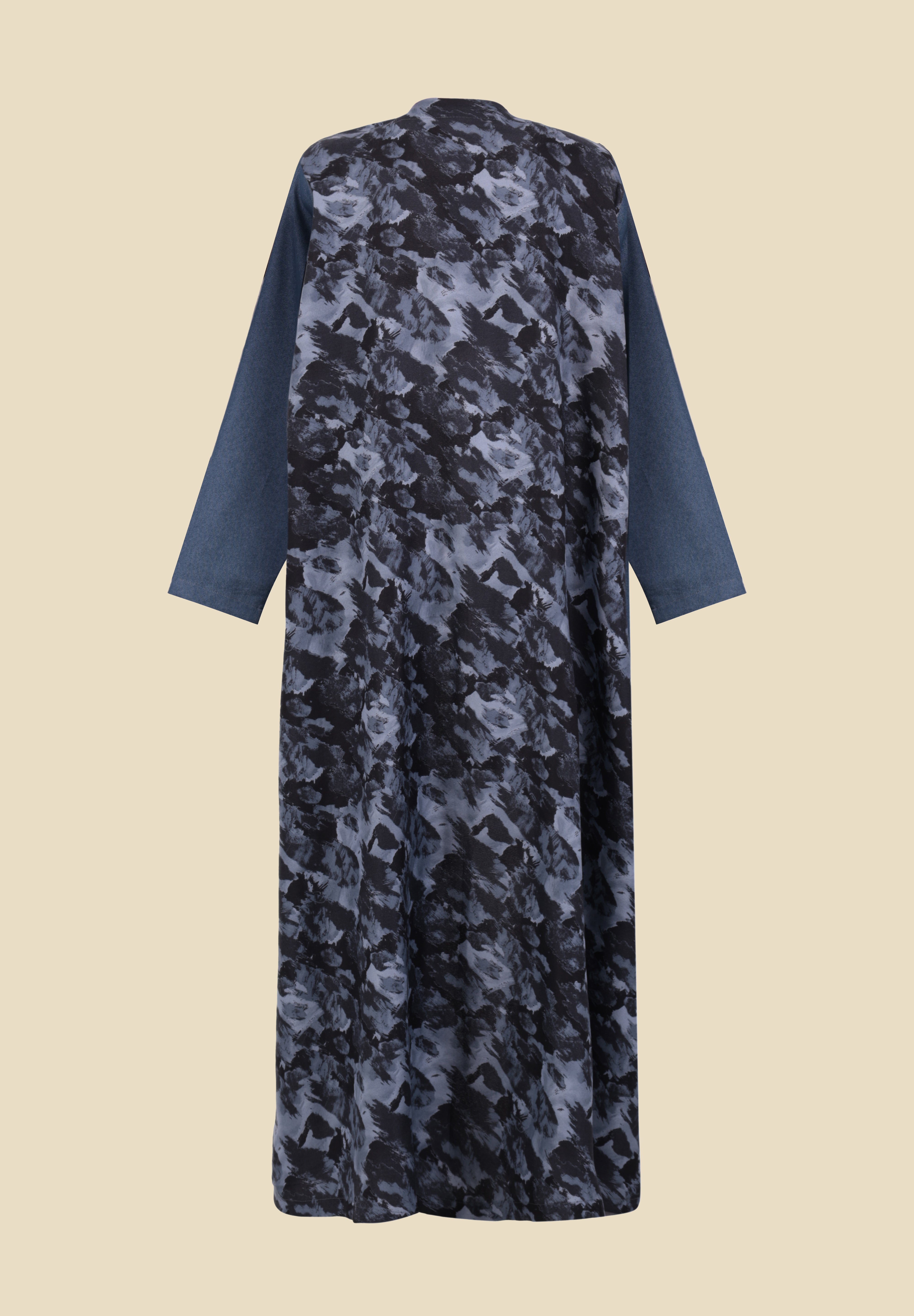 Abaya bi-matière combinant un devant en denim et un dos en tissu satiné. Finitionsdétaillées avec un col travaillé et des surpiqûres tout au long.