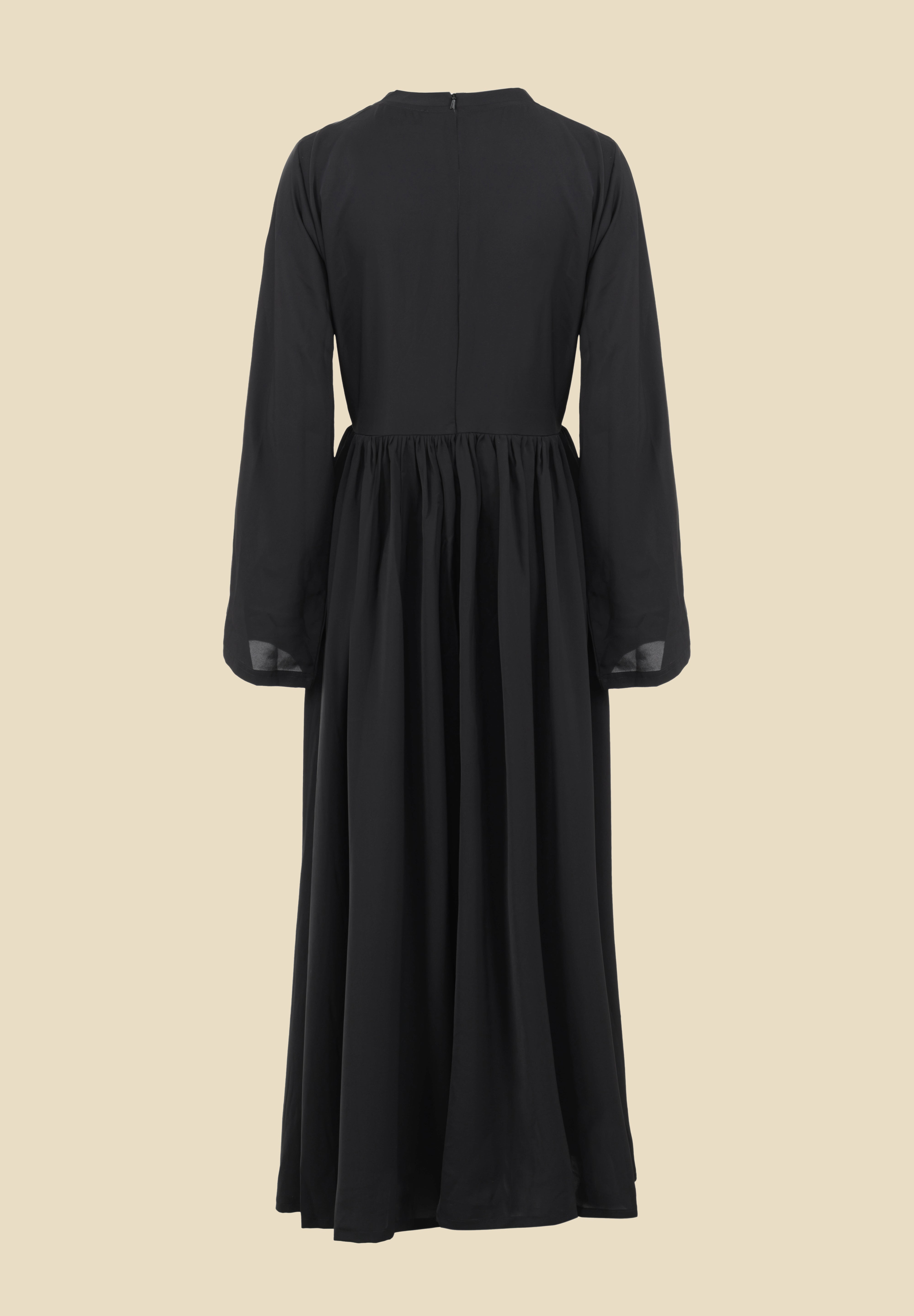 Robe en crêpe à jupe évasée avec un corset asymétrique structuré. Les manches cloche et la fermeture zippée au dos soulignent sa sophistication intemporelle.