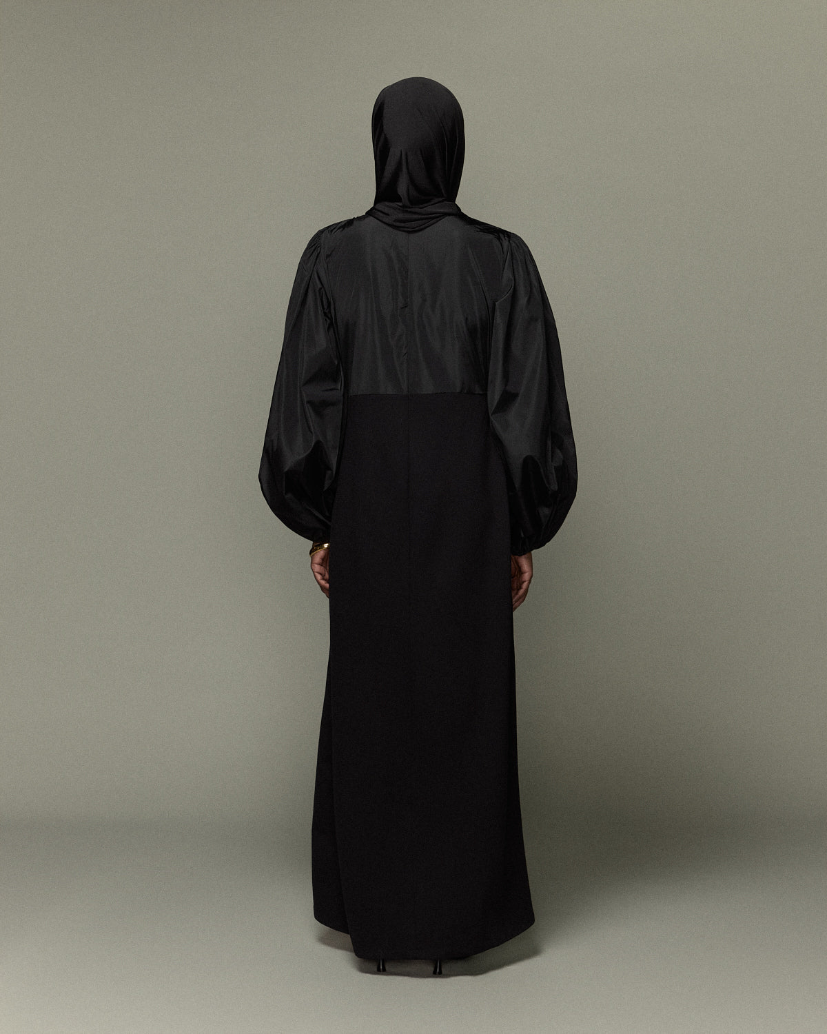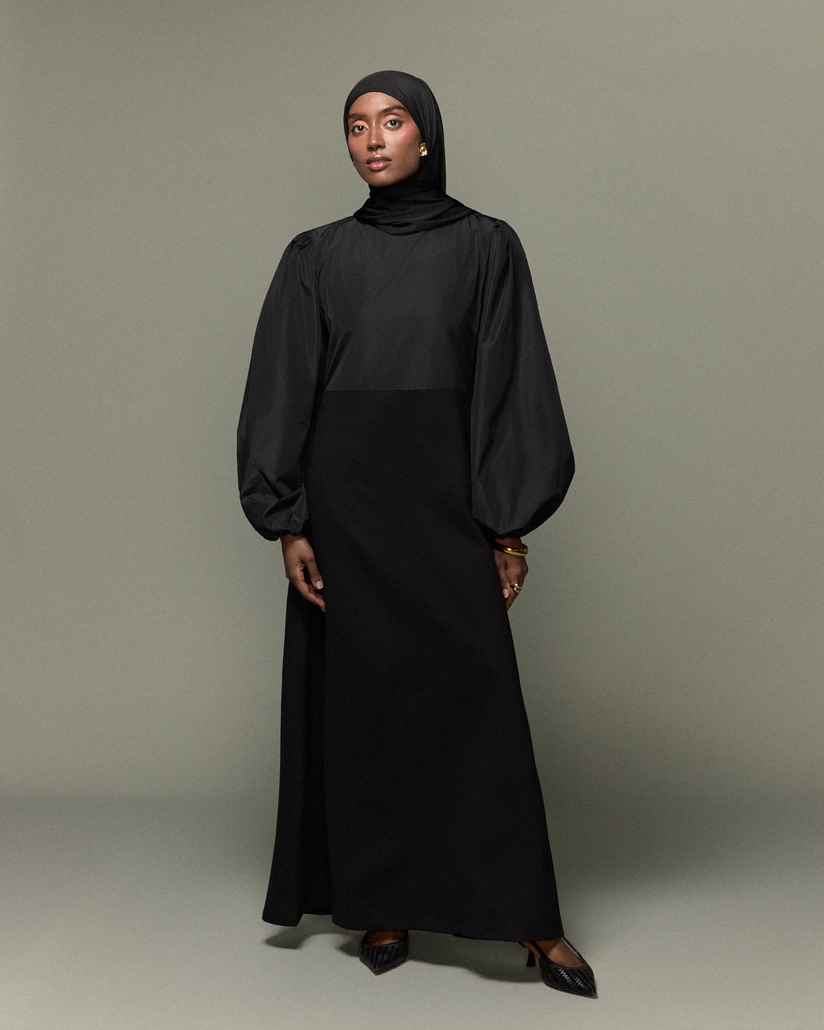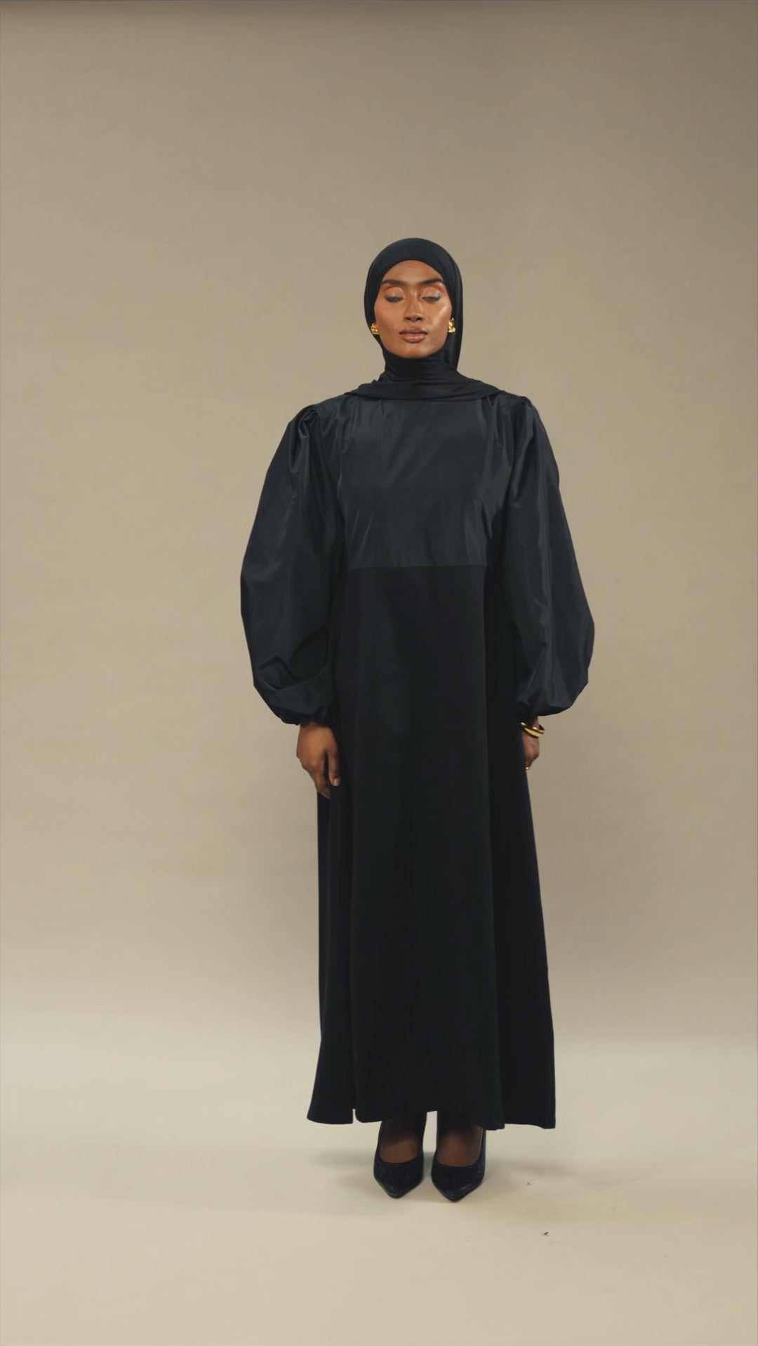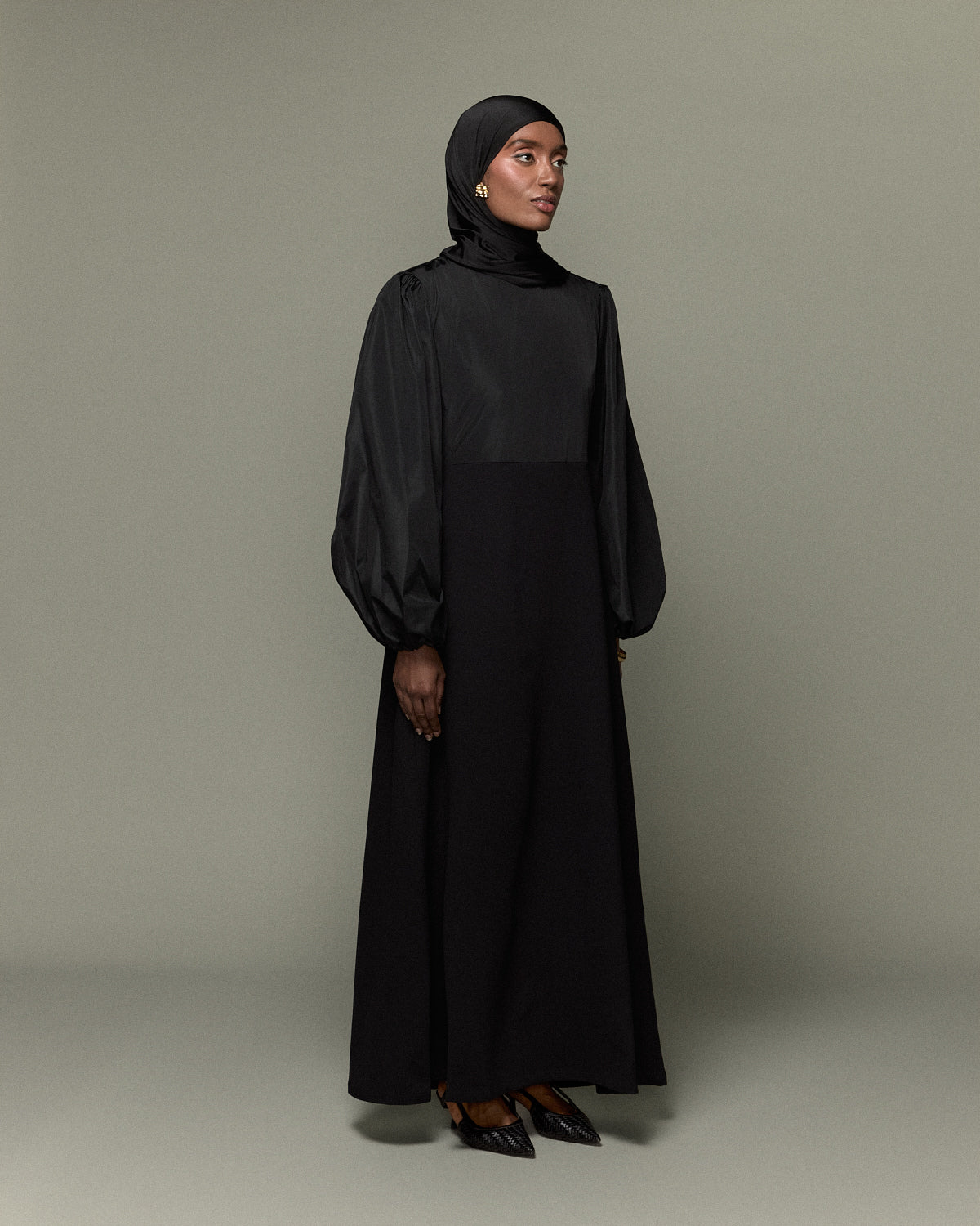 Une robe noire sophistiquée, alliant une coupe fluide à des manches ballons. Son tombé impeccable et sa fermeture discrète au dos subliment la silhouette avec élégance. Une pièce intemporelle pour une allure majestueuse et pudique.