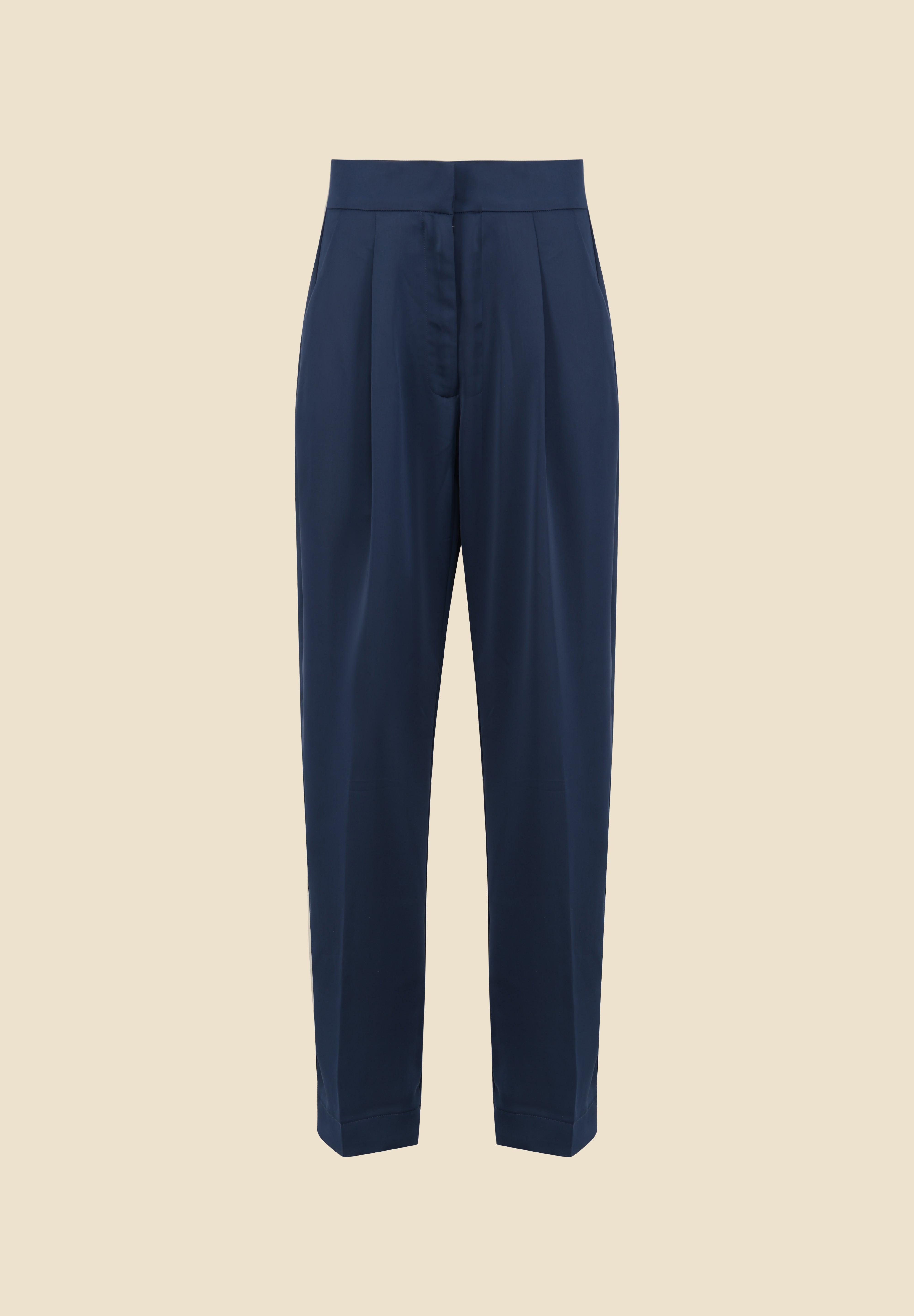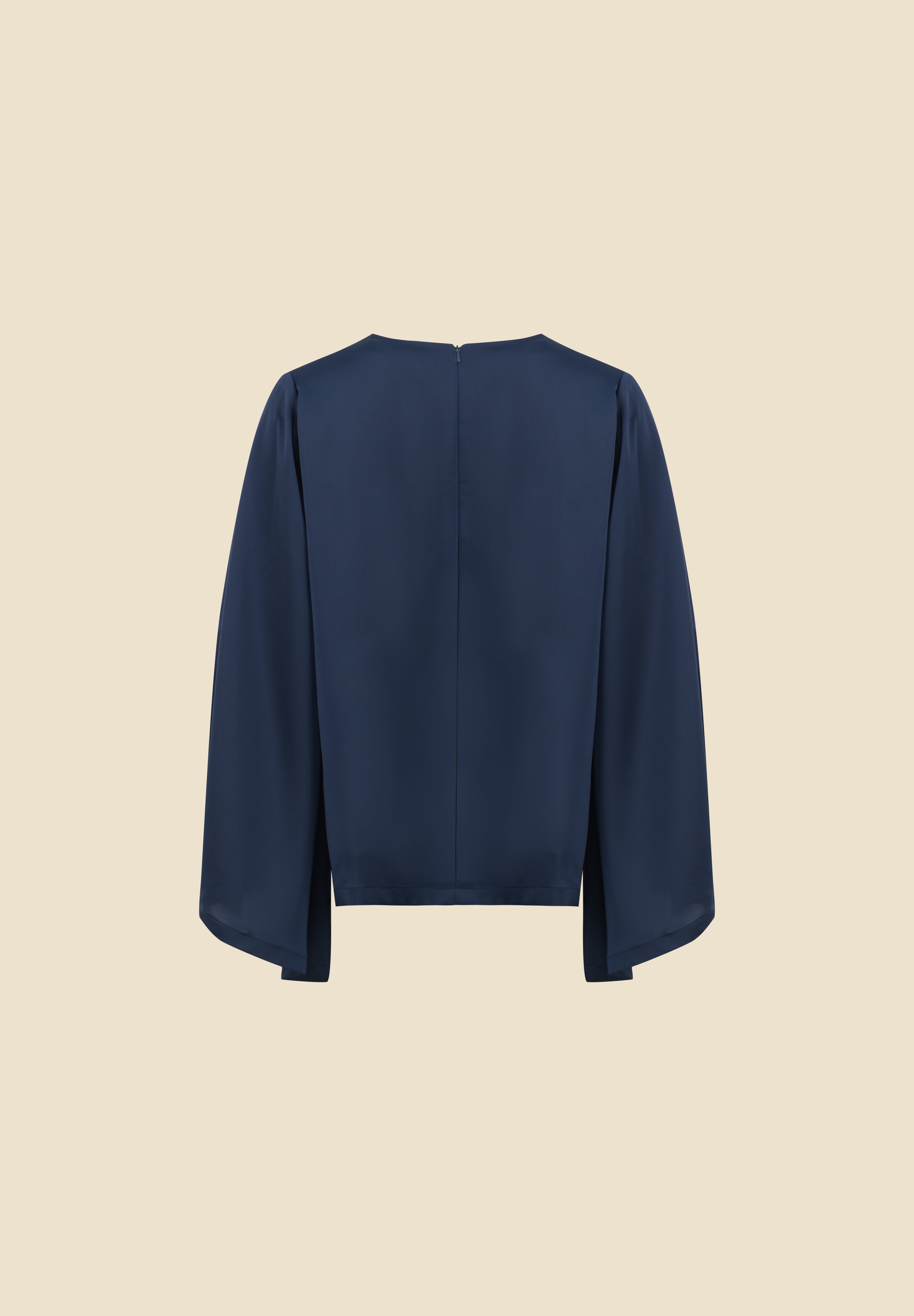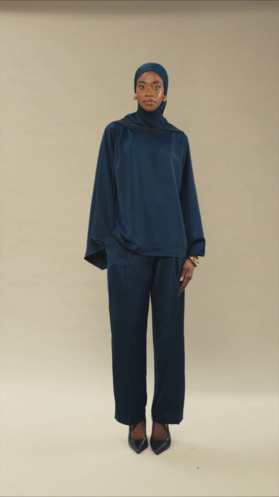 Un ensemble composé d’un top drapé aux manches évasées et d’un pantalon fluide en satin bleu nuit. Son tombé parfait et son design épuré en font une pièce incontournable pour un style chic et intemporel.