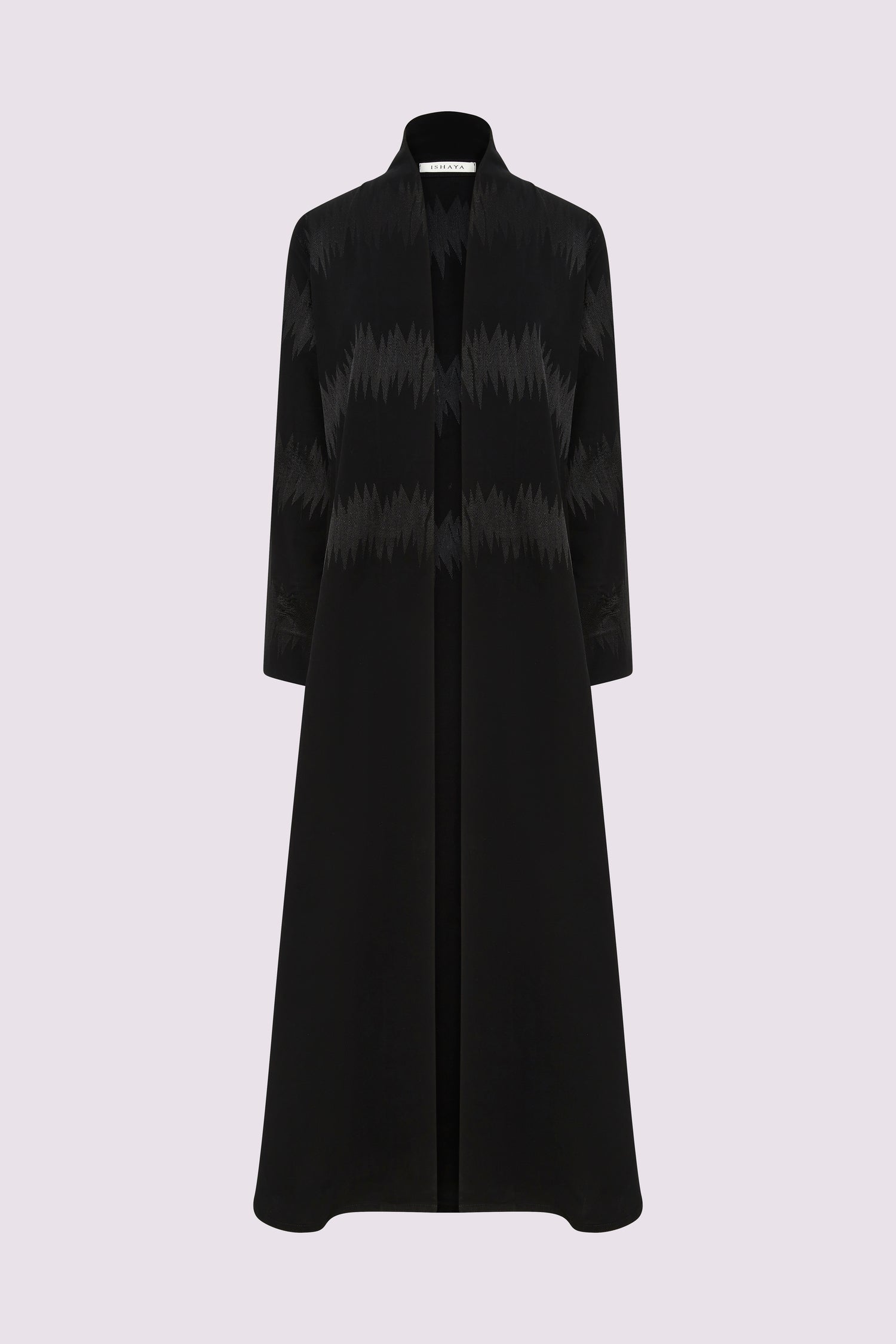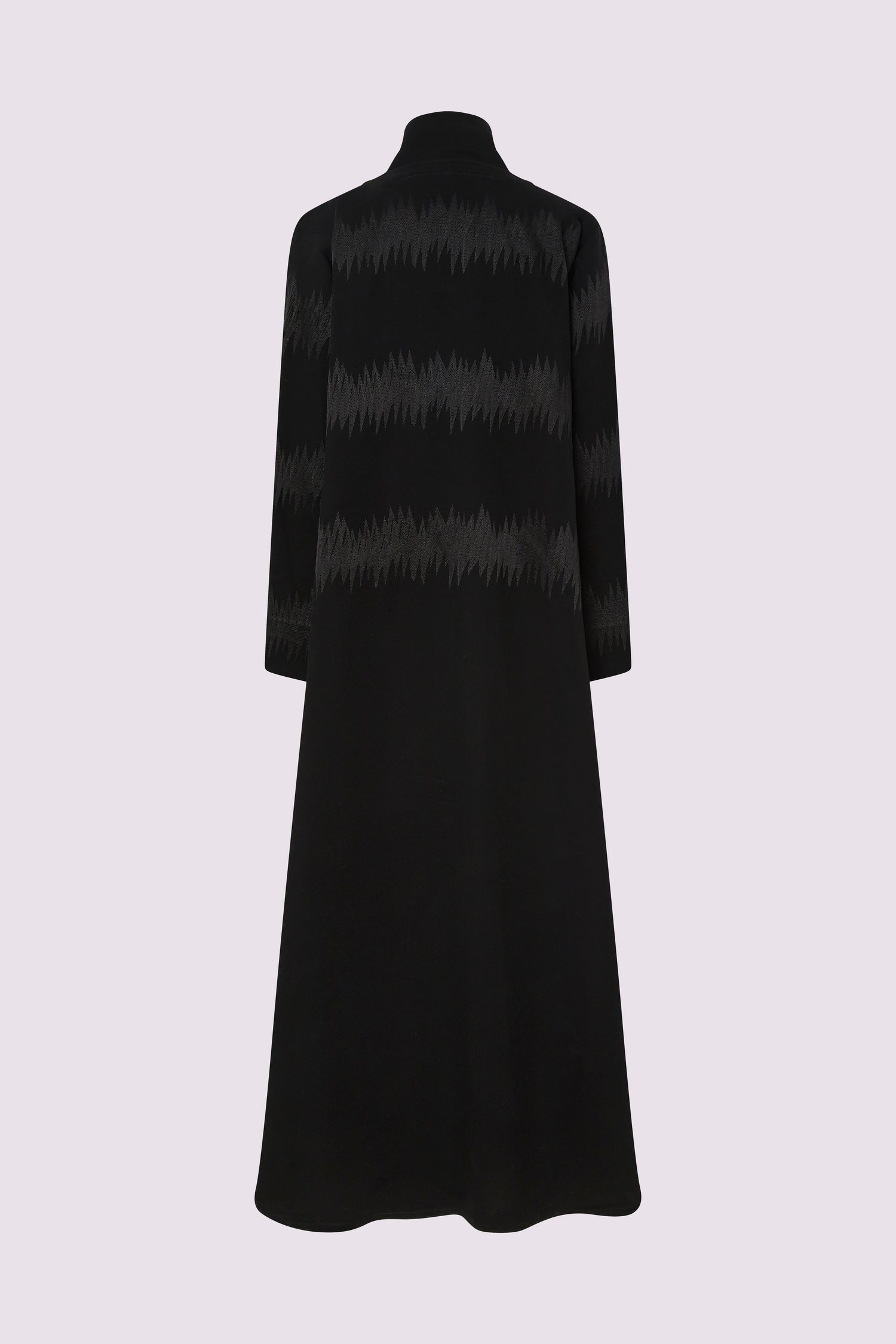 L'Abaya Nya équilibre un motif monochrome saisissant avec une silhouette intemporelle. Une pièce forte et moderne, conçue pour une élégance naturelle et sans effort.