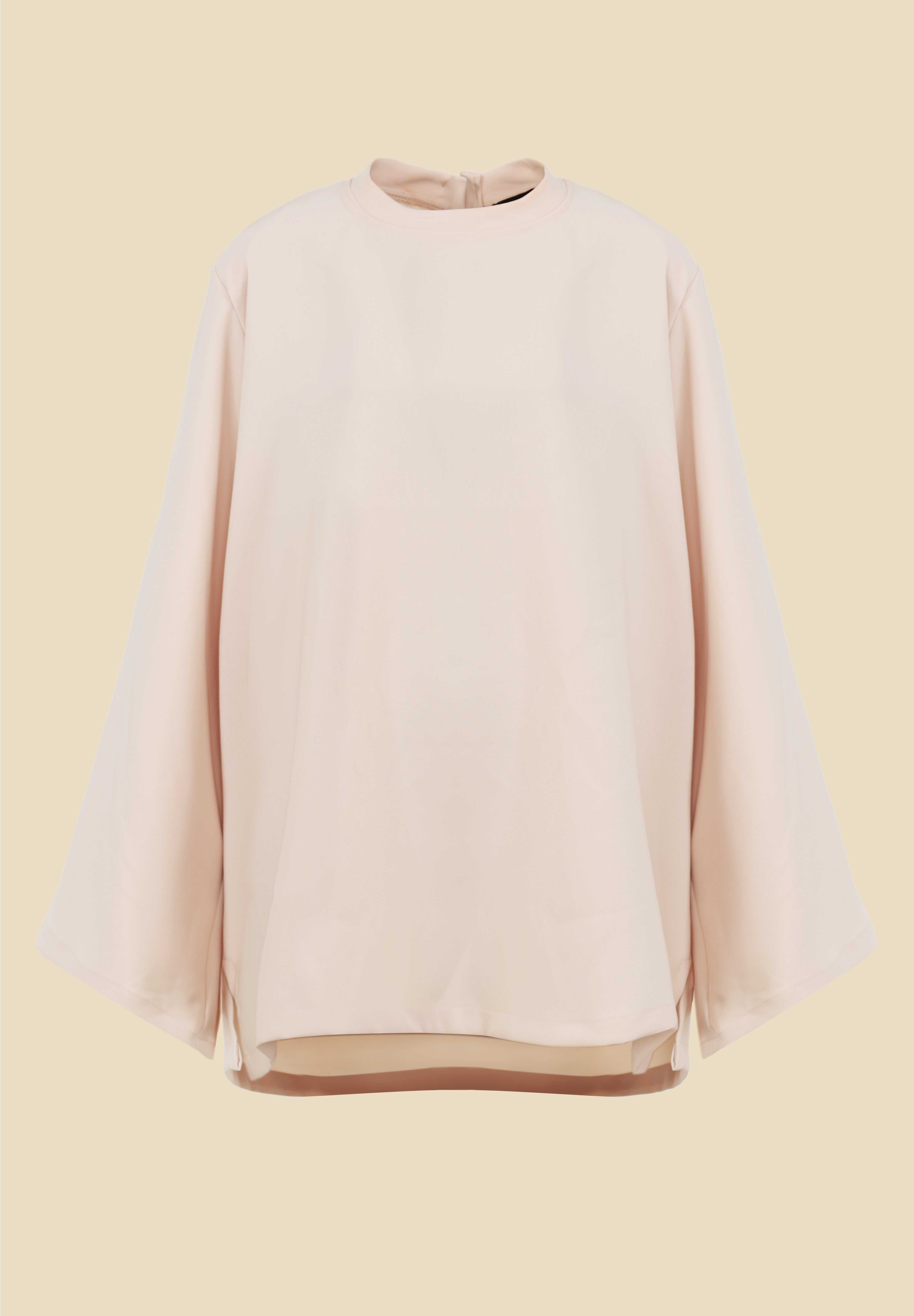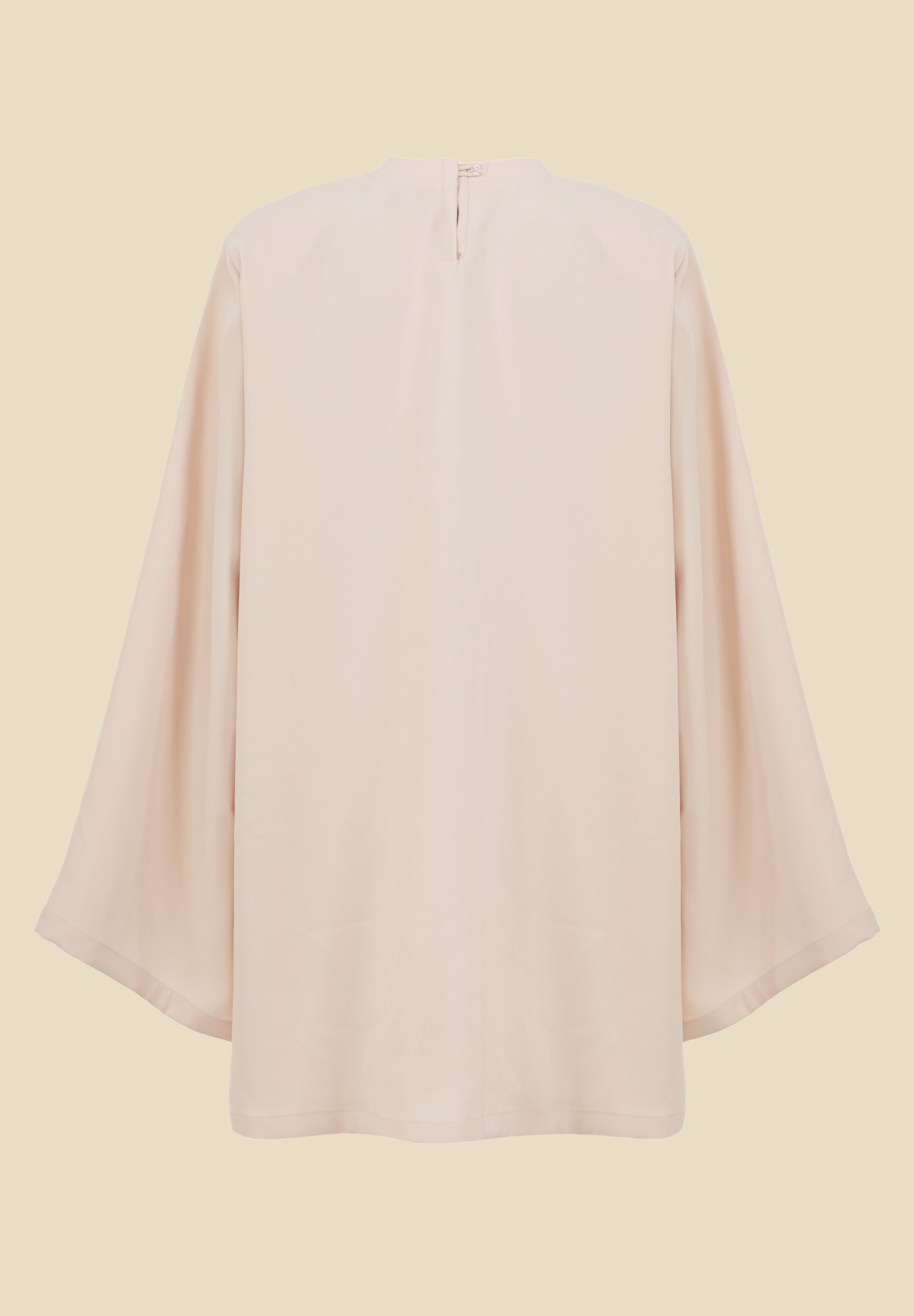 Haut ample en tissu crêpe, conçu avec des manches évasées et des épaulettes structurées. Les fentes latérales ajoutent une touche de fluidité et d’élégance.