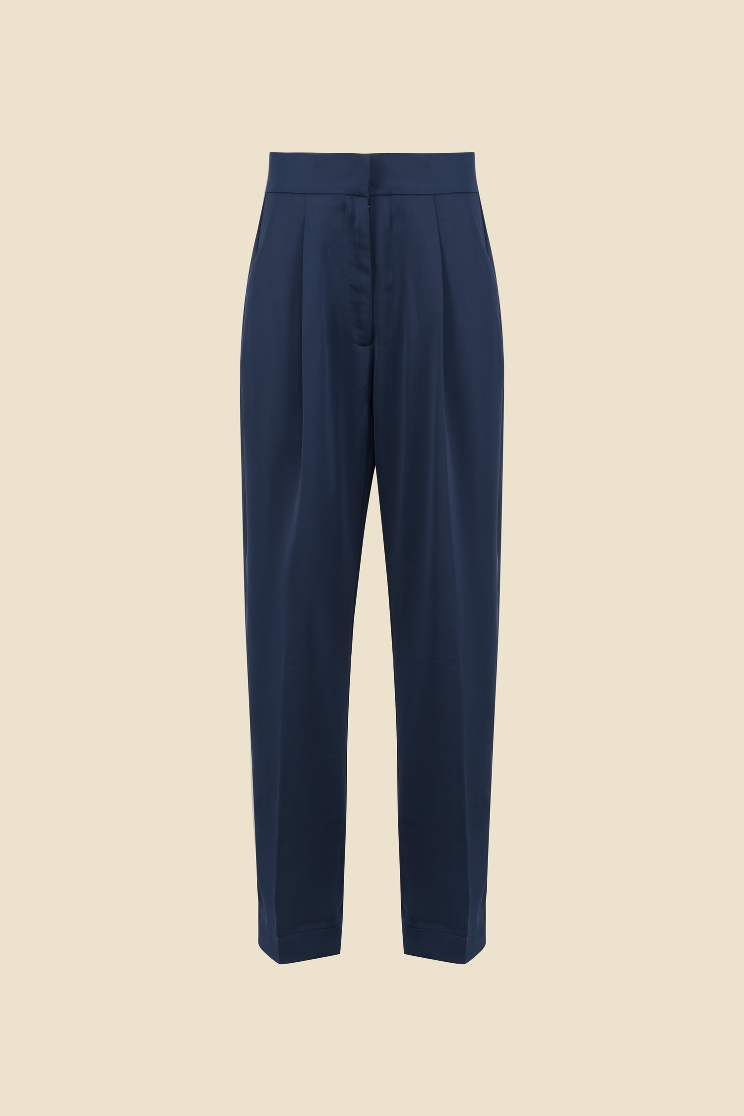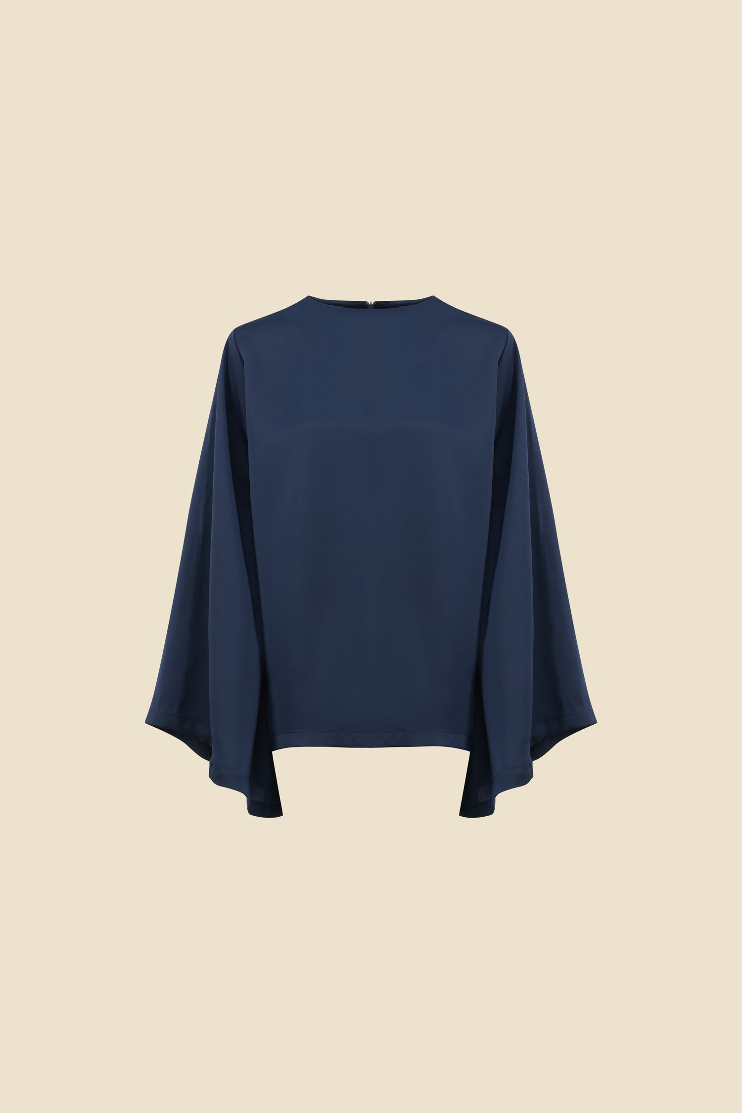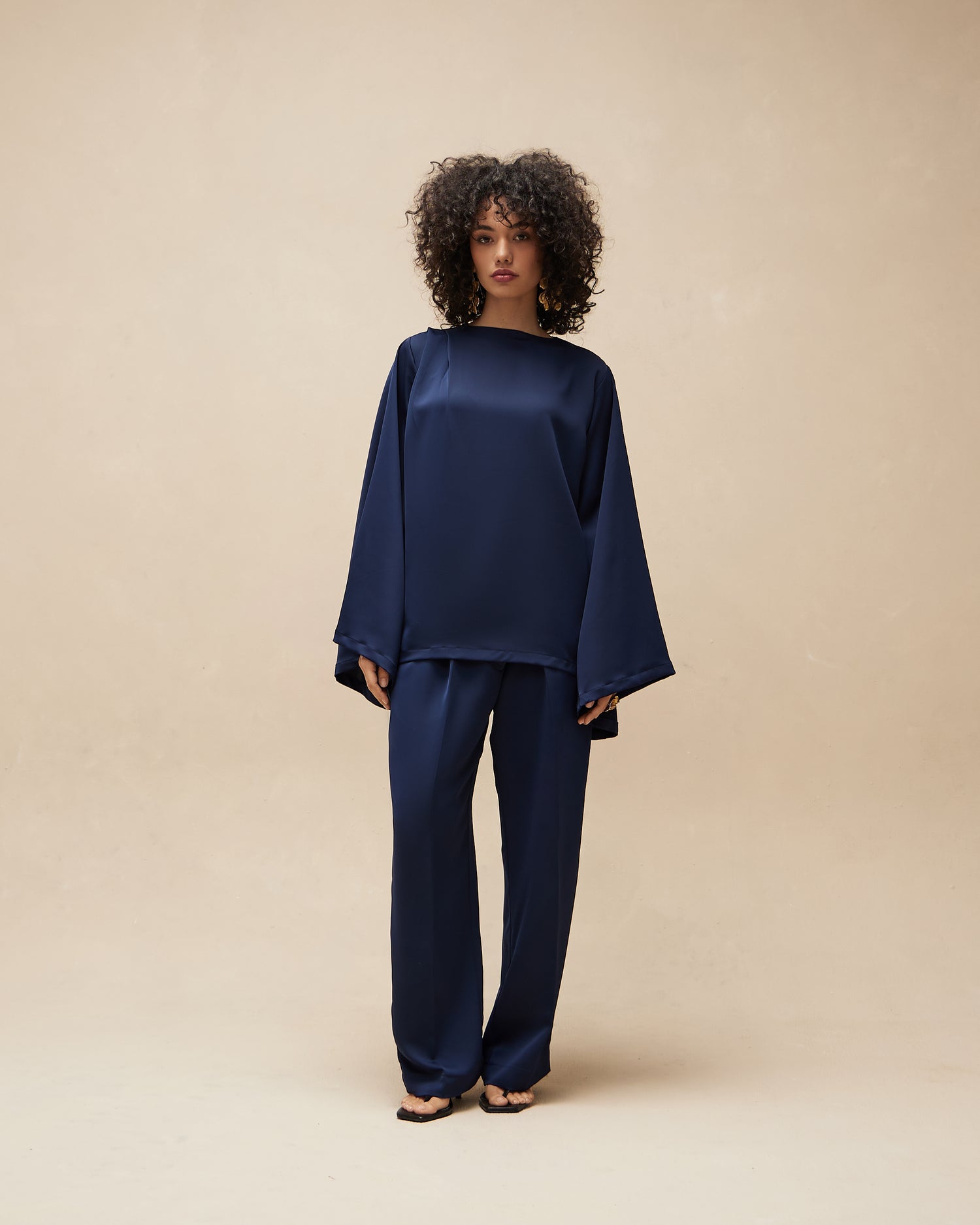 Un ensemble composé d’un top drapé aux manches évasées et d’un pantalon fluide en satin bleu nuit. Son tombé parfait et son design épuré en font une pièce incontournable pour un style chic et intemporel.