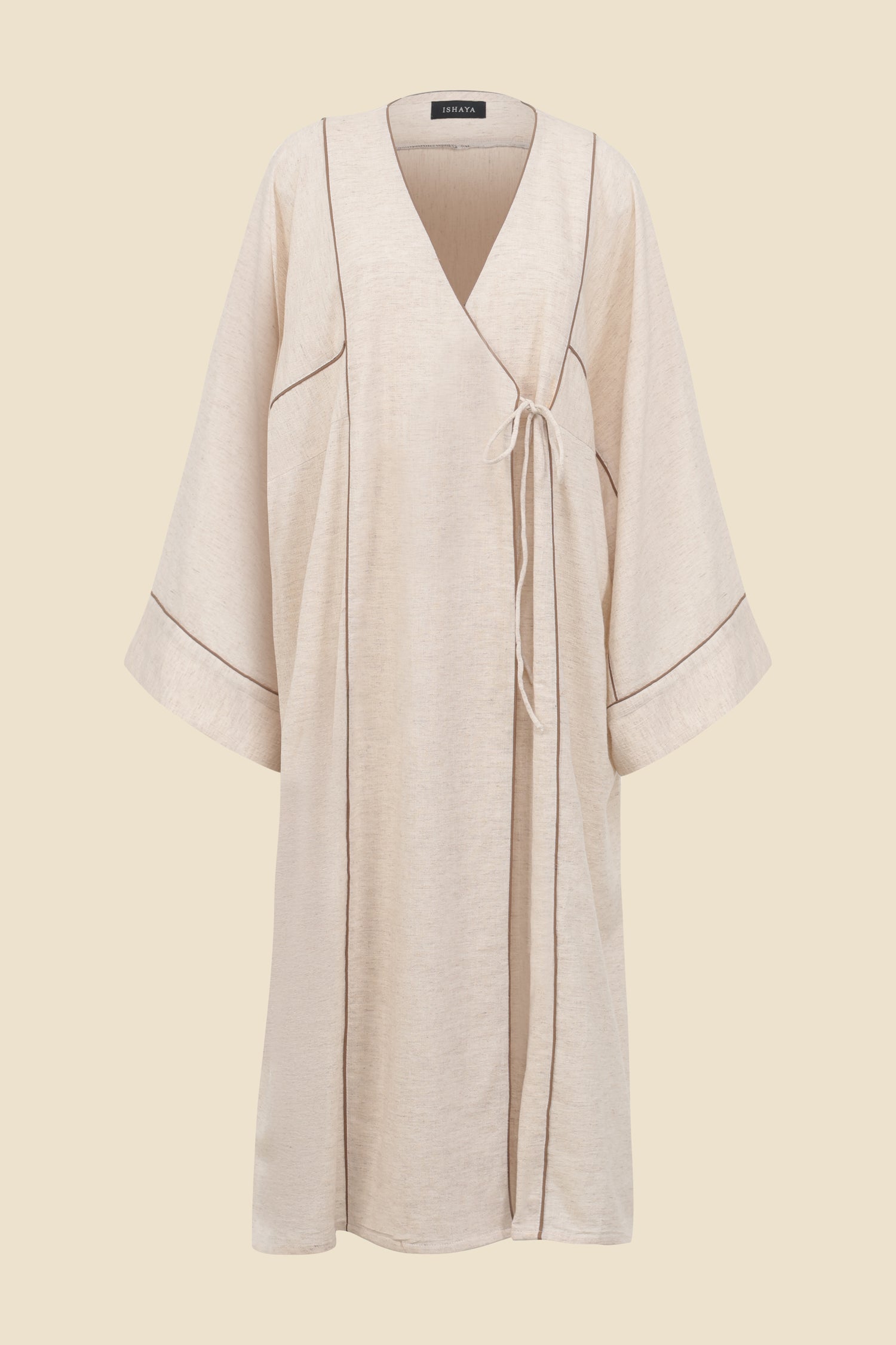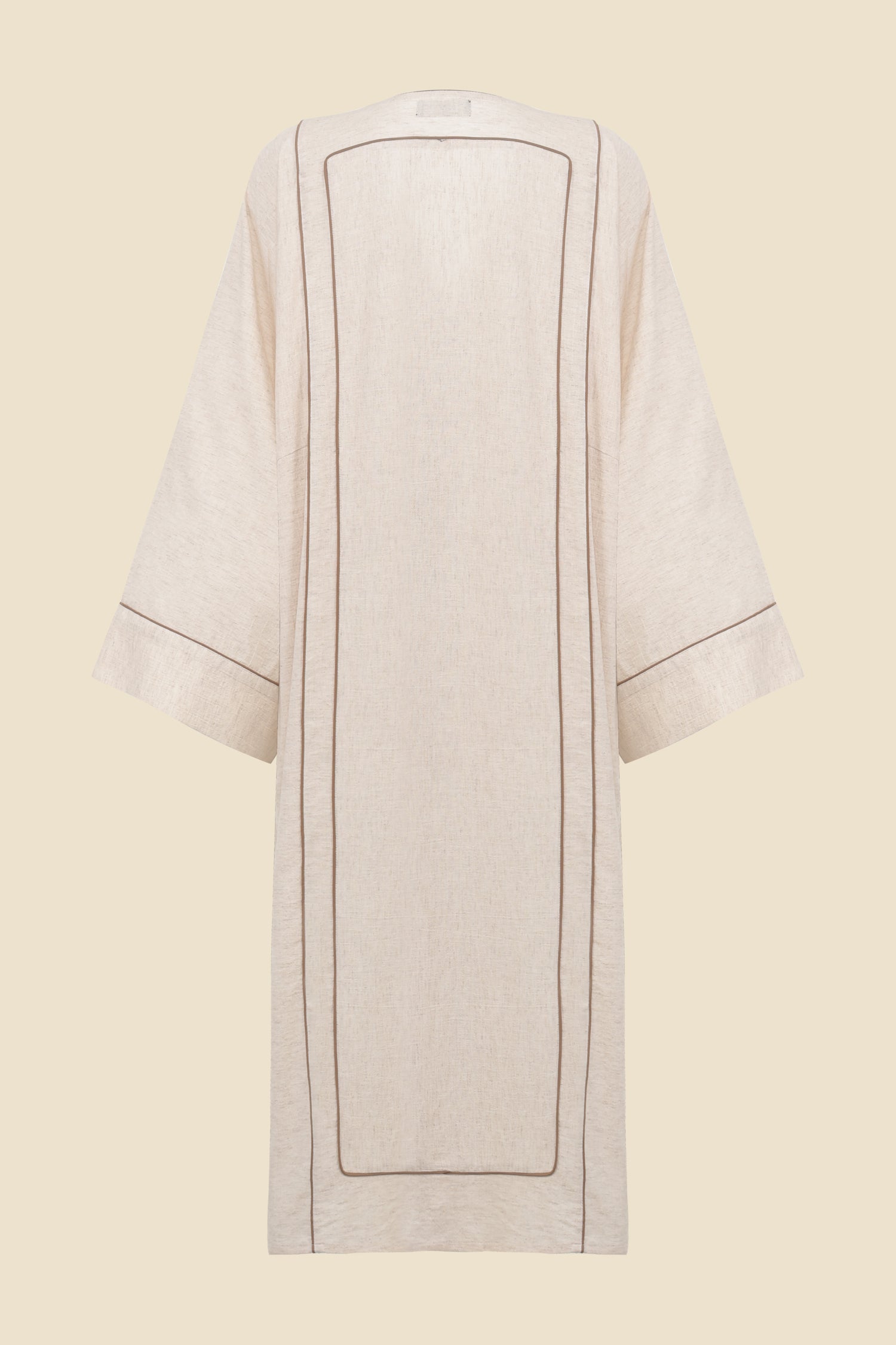 Kimono 100% lin, sublimé par des surpiqûres  marron et un détail dans le dos. Cordon de serrage pour une allure structurée ou fluide selon l’envie.